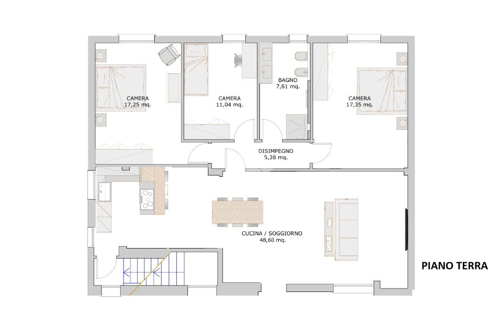 L'abitazione, completamente indipendente, è così composta: spazioso open-space di oltre 46 mq, affacciato sul giardino privato, un disimpegno dalla quale si accede alla zona notte dove si collocano le 3 camere da letto, di cui due matrimoniali ed un bagno finestrato; da una scala interna si accede al piano interrato dove trovano spazio una comoda lavanderia, una centrale termica ed una ampia cantina.